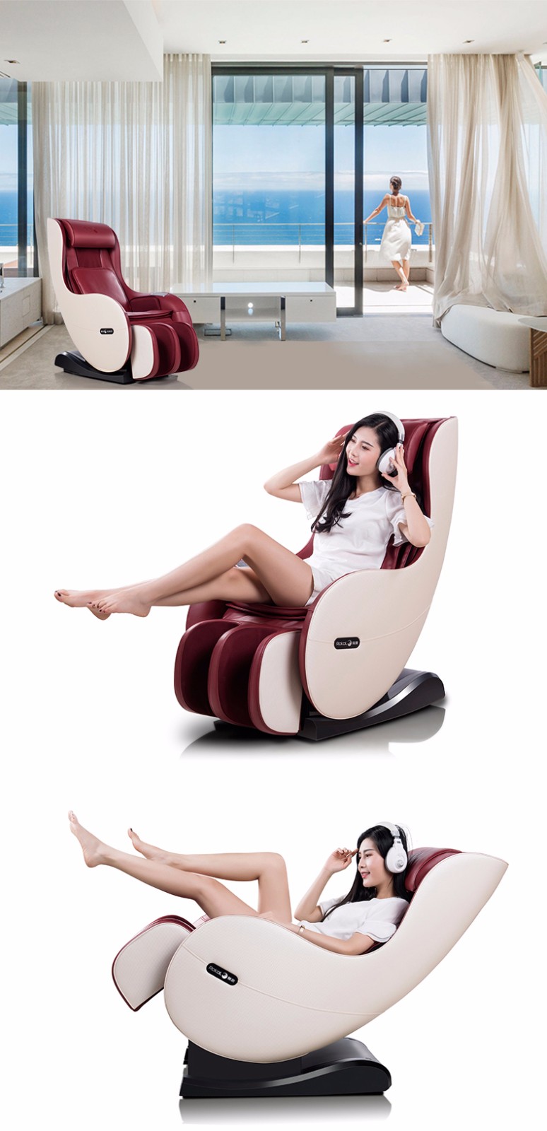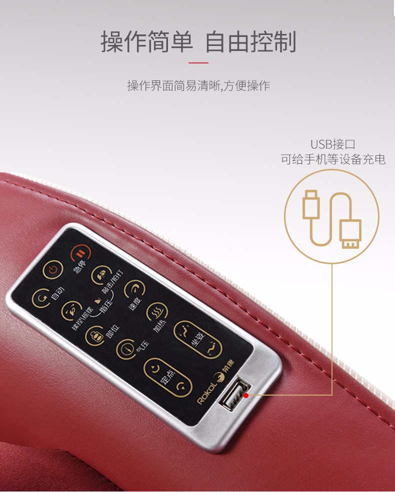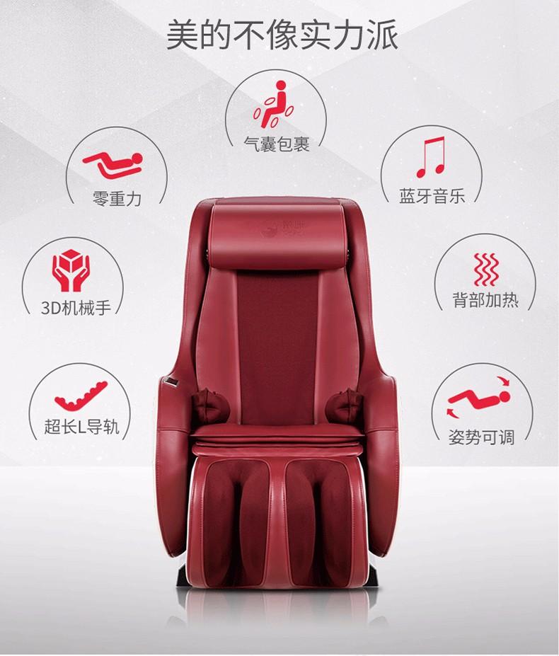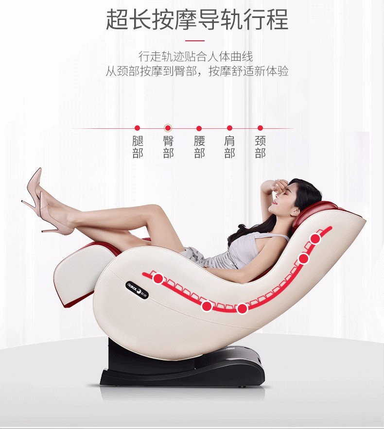 额定功率:95w 额定电压:220v50hz 定时:10/20/30 尺寸:椅背直立:112.5*68.5*111.5cm 椅背后仰:140.8*68.5*77cm 净重:约50kg 专利东方手感超薄按摩机芯 超长L型曲线导轨 按摩轮加热按摩 座部、腿部气压按摩 零重力、音乐按摩放松身心 时尚外观 家居首选